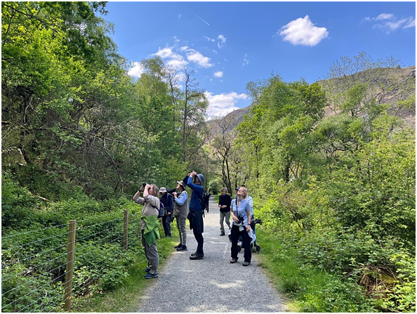 We started by exploring the ancient oak woodland around Afon Elan just below the dam. Hearing birds was easy, but finding them amongst trees in leaf was more tricky, but eventually we managed to locate Pied Flycatcher, Spotted Flycatcher, Redstart and Wood Warbler.